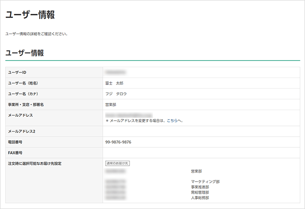 (以下の同手順で、「事業所・部署名・電話番号・FAX・パスワード変更・Eメール受信可否・ユーザーIDへのお届け先紐づけ」の変更も可能となります。)